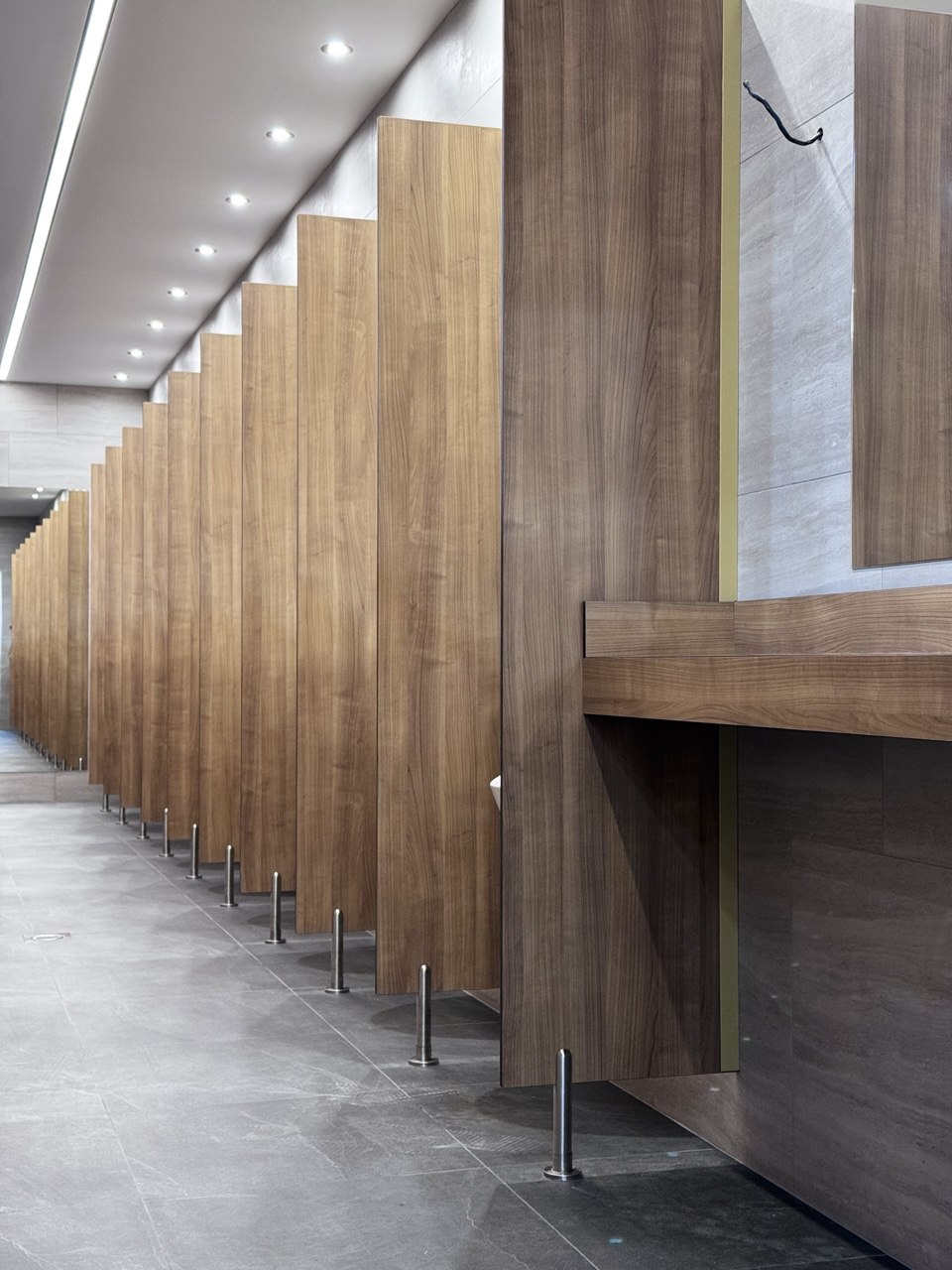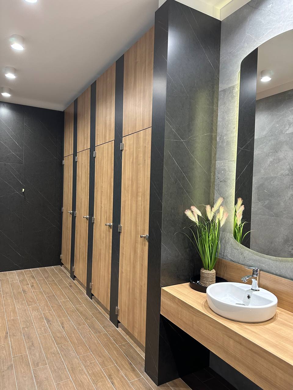 Панелі HPL — це стандарт для громадських просторів. Вони міцні, абсолютно вологостійкі та антибактеріальні. Такі санвузли служать роками, не втрачаючи первинного вигляду та залишаючись актуальними.